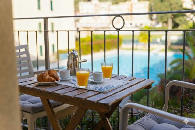 Im Außenbereich lädt ein kleiner Balkon mit Blick auf den Pool und das Meer zum Verweilen ein – ausgestattet mit Tisch und Stühlen, ist er der ideale Ort für eine entspannte Pause nach dem Strandbesuch.