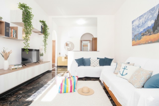 Die Wohnung befindet sich im ersten Stock einer Villa mit Panoramablick, ist ca. 100 Quadratmeter groß und bietet Platz für bis zu 6 Personen. Sie besteht aus einem großen Wohnzimmer mit Smart-TV, einer voll ausgestatteten Küche, 3 Schlafzimmern (zwei Doppelzimmer und eines mit zwei Einzelbetten) und 2 Badezimmern (eines mit Badewanne und Waschmaschine, eines mit Dusche). Zwei Balkone bieten Blick auf das Meer und die umliegende grüne Landschaft.