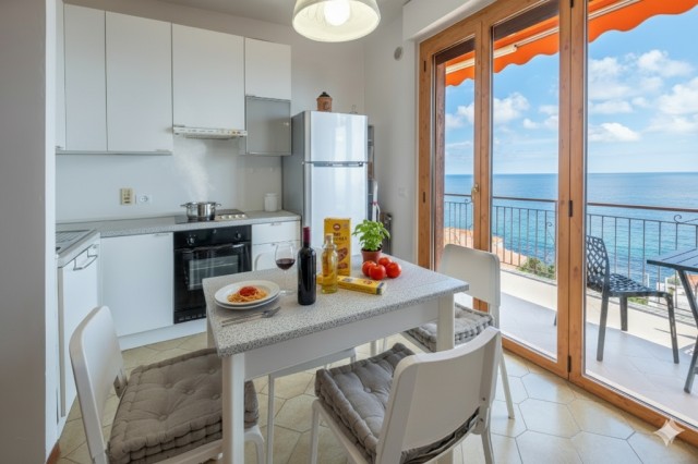 Meerblick-Zweizimmerwohnung im 3. Stock (mit Aufzug) im Herzen der Riviera dei Fiori, ideal für den Strandurlaub. Ca. 45 qm, maximal 4 Personen: helles Wohnzimmer mit Schlafsofa (Doppelbett), voll ausgestattete Kochnische (Gasherd, Kühlschrank mit Gefrierfach, Toaster), 1 Doppelzimmer, Badezimmer mit Dusche. Terrasse mit Tisch, Stühlen und Liegestühlen – perfekt für Frühstück mit Aussicht oder einen Aperitif zum Sonnenuntergang.