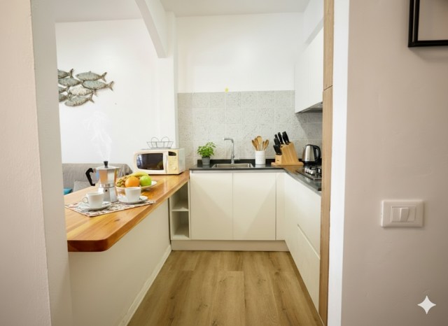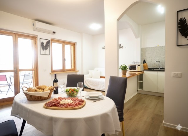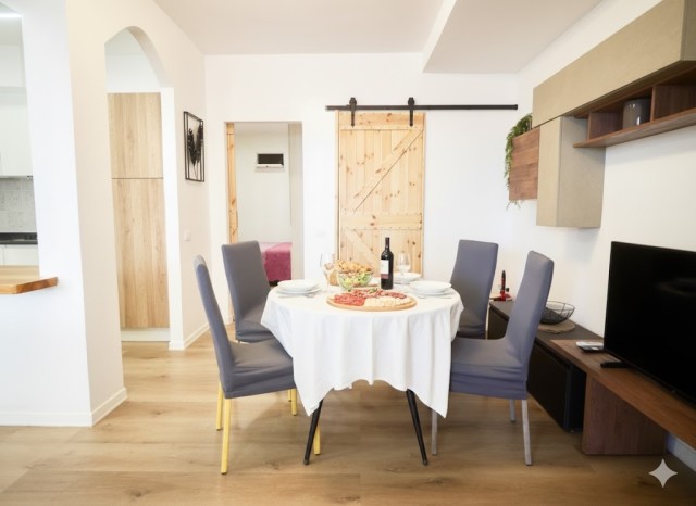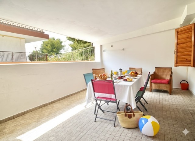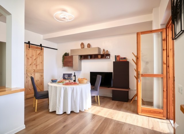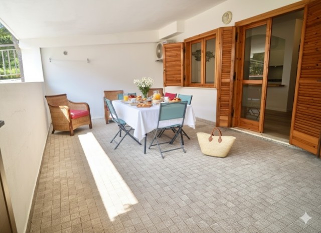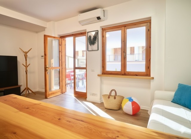 This cosy one-bedroom apartment has been fully refurbished with modern furnishings. It is located on the ground floor and features a private furnished terrace and access to the shared swimming pool. It can accommodate up to 4 guests: one bedroom with double bed plus a double sofa bed in the living room. The kitchenette is fully equipped: 4-burner gas hob, fridge with freezer, microwave, kettle and toaster. The bathroom has a shower. Washing machine, SAT TV, air conditioning, independent heating, iron and ironing board are included.